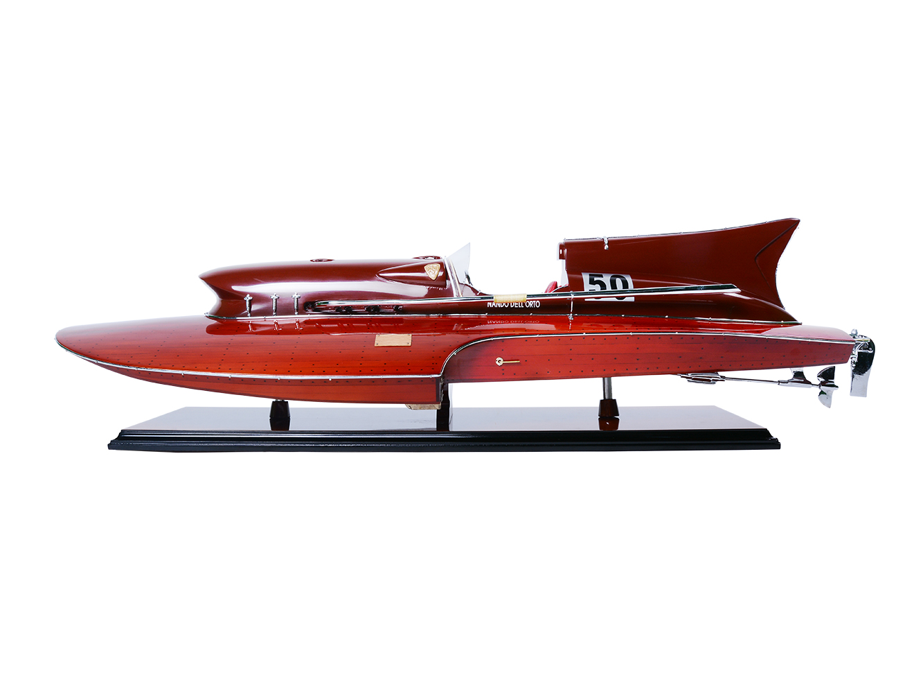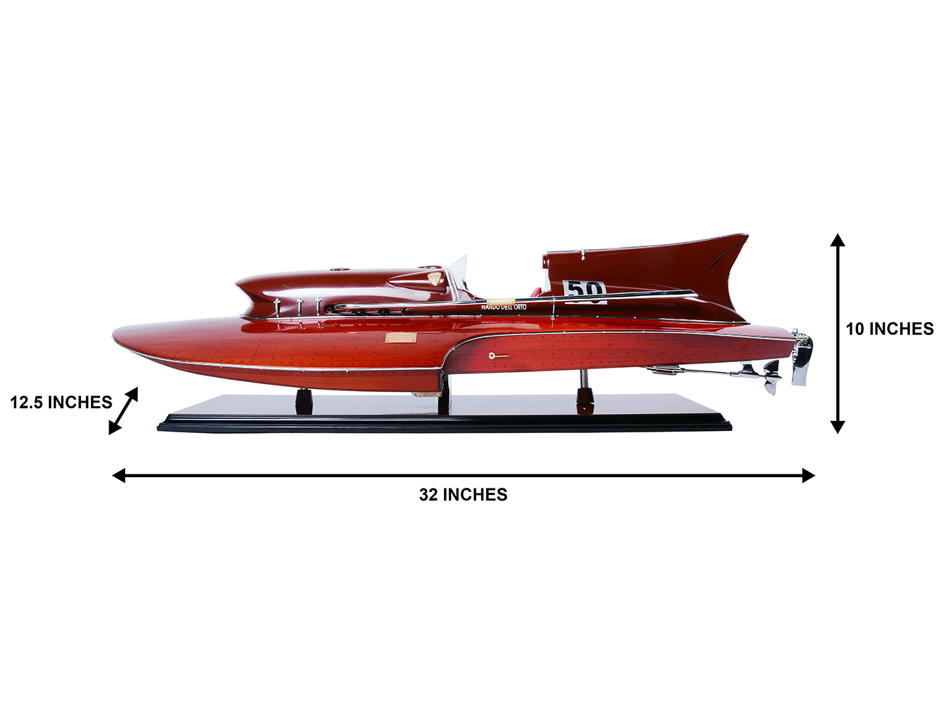Introducing the exceptional Ferrari Hydroplane Model Ship by OMH – a tribute to the iconic racing boat that set world speed records in the 1950s. This beautifully crafted model is a stunning display of Italian engineering and craftsmanship, capturing the essence of the original boat in every detail.