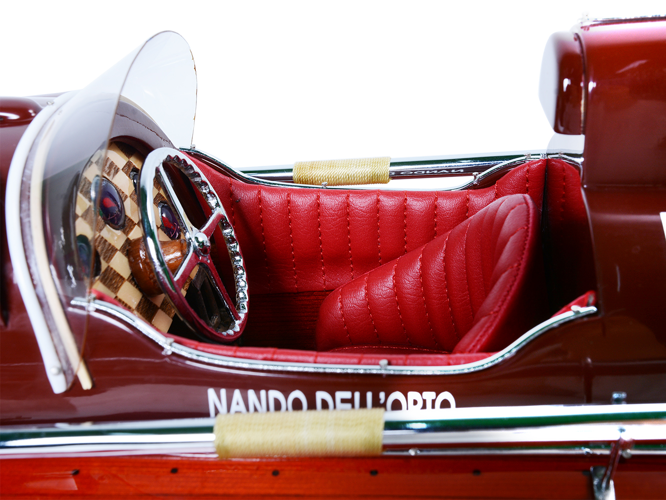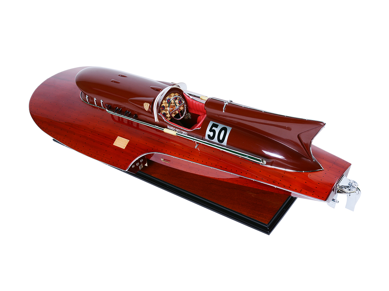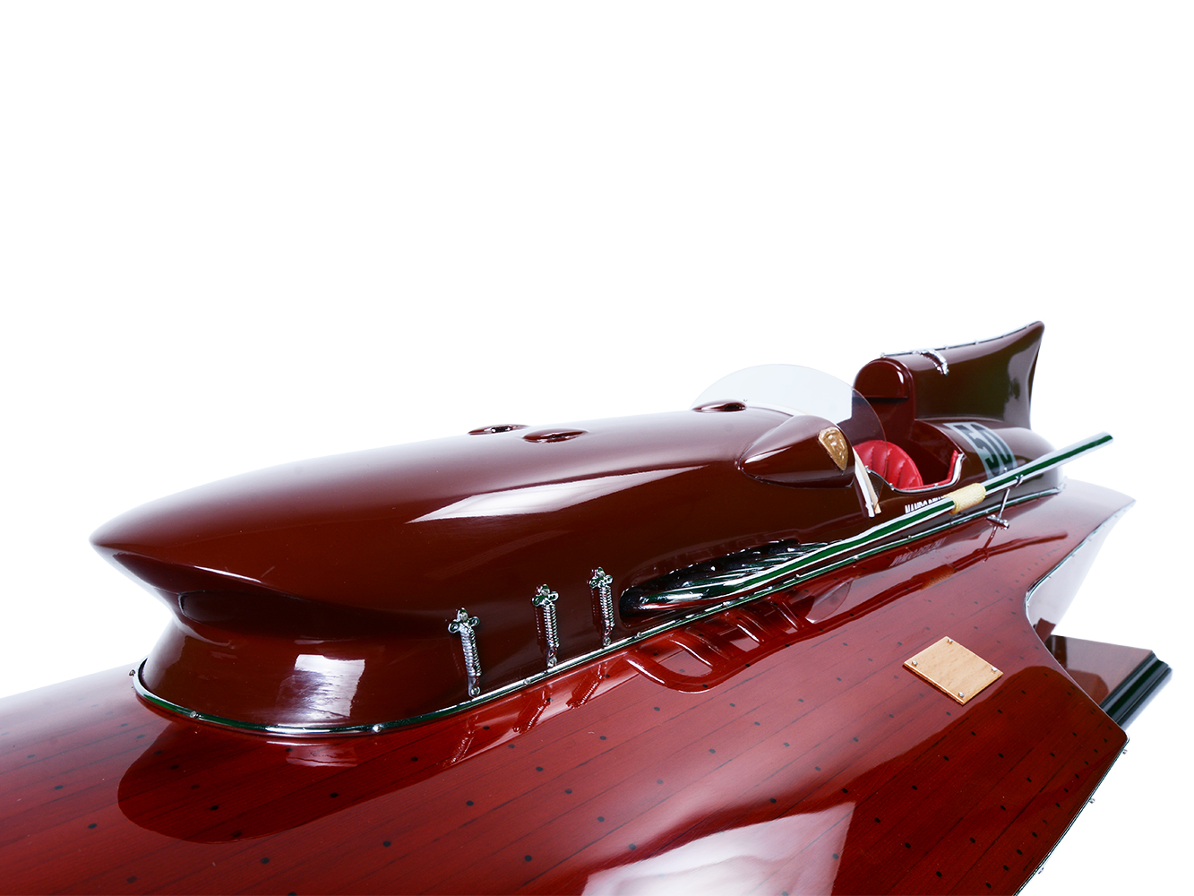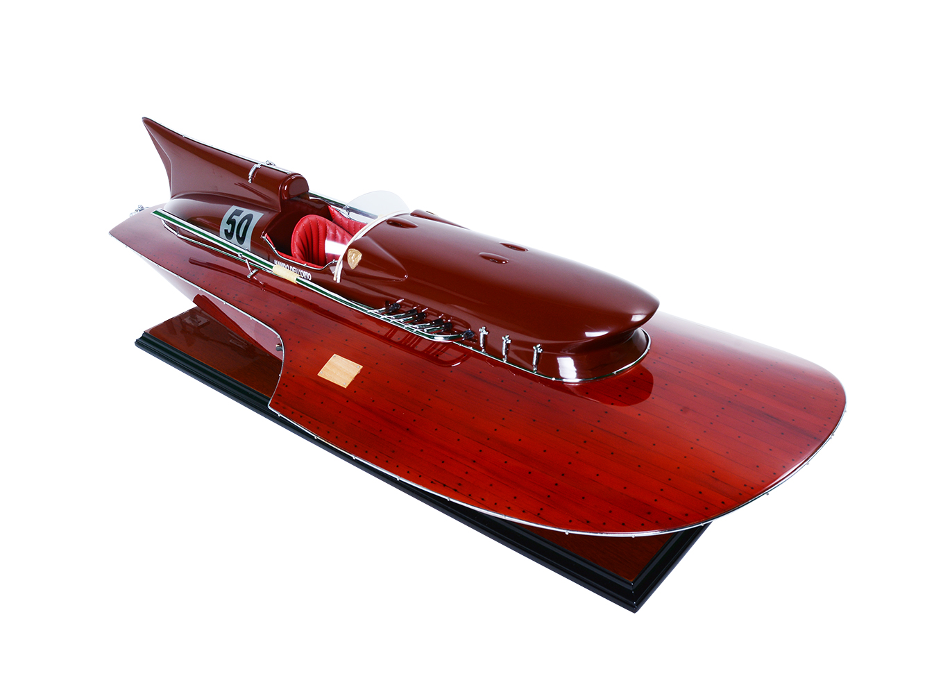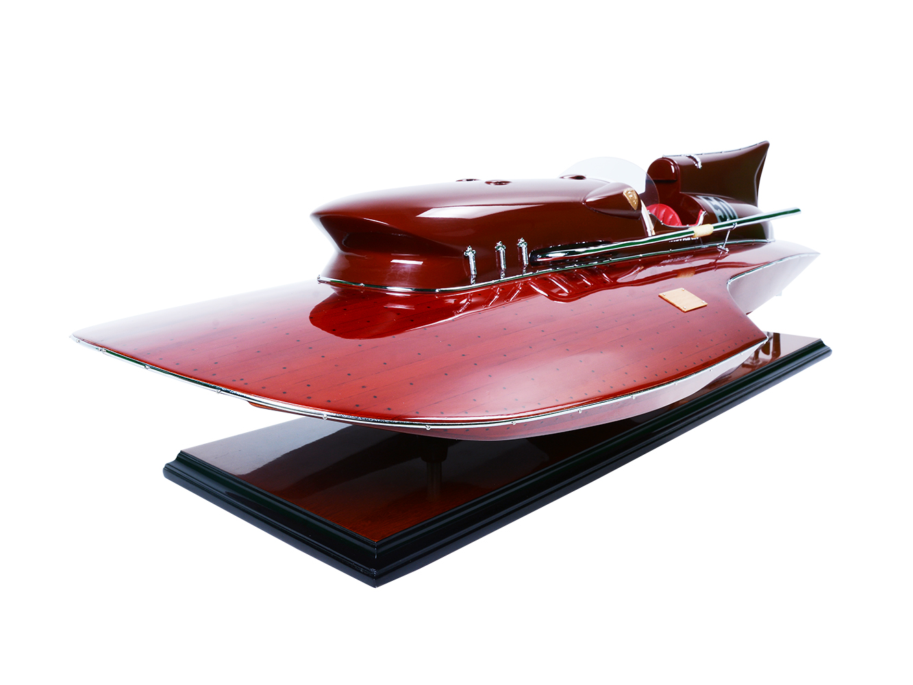 The Ferrari Hydroplane Model is a true masterpiece, measuring an impressive 35 inches in length and handcrafted from the finest materials. The hull is made from high-quality wood, carefully shaped and sanded to create a smooth, streamlined form that accurately reflects the original boat’s design.