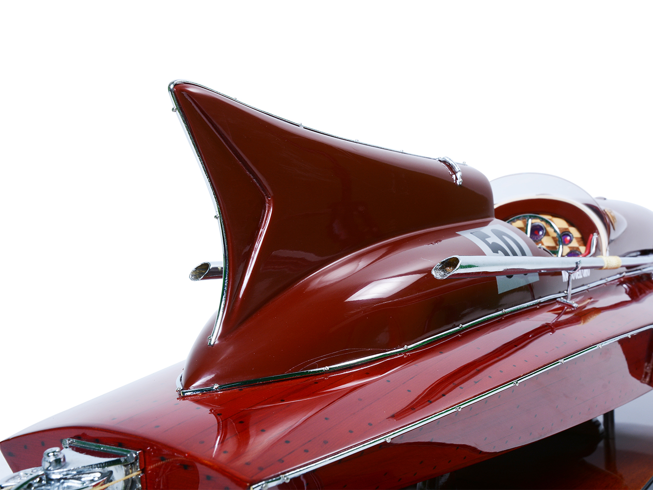 The model’s exterior is finished in a lustrous red paint, beautifully contrasting with the wooden deck and chrome fittings. The chrome-plated details, including the propellers and exhaust pipes, add a touch of luxury and sophistication to the design, just like the original boat.